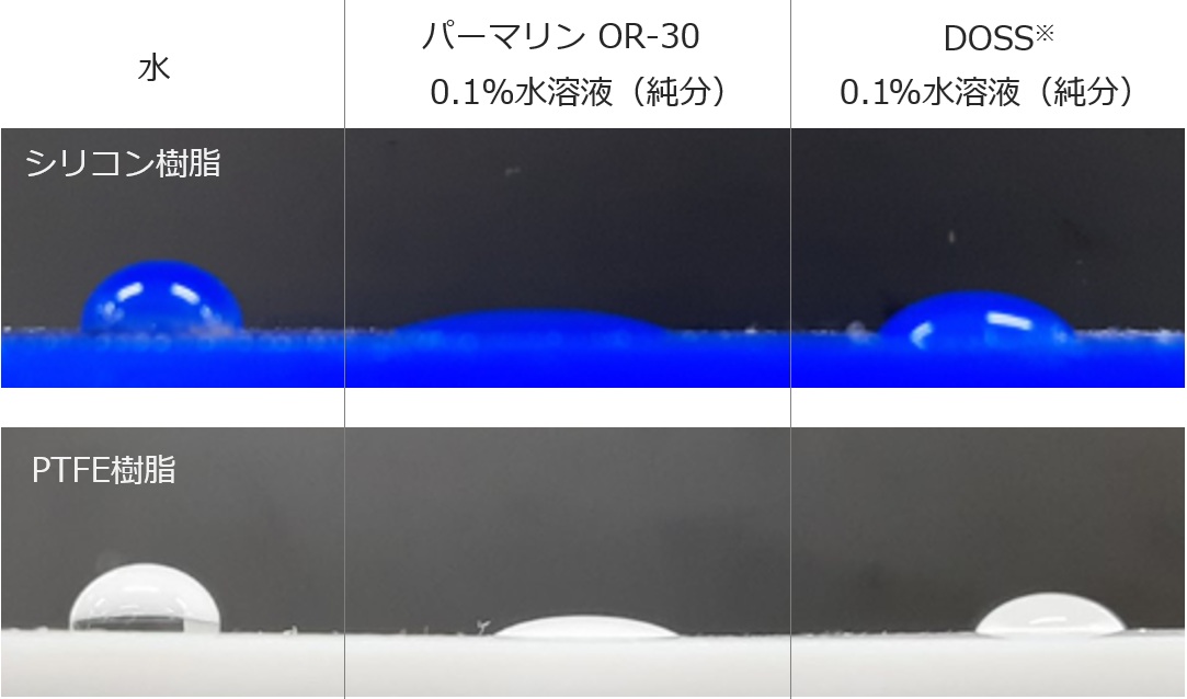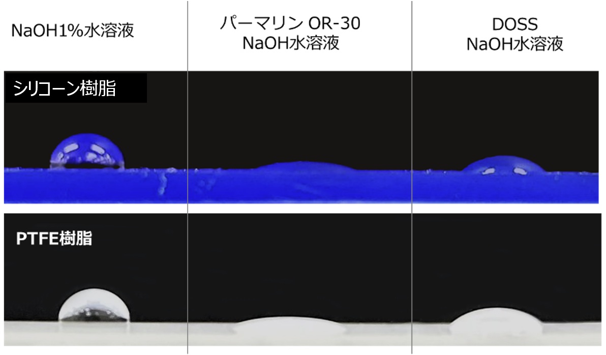 難濡れ基材(シリコーン樹脂およびポリテトラフルオロエチレン(PTFE))上に、ブランクとして水酸化ナトリウム1%水溶液、ならびに『パーマリン OR-30』を0.1wt%(純分)含有する水酸化ナトリウム1%水溶液を滴下し、液滴の濡れ広がり挙動を観察した。比較品として、ジオクチルスルホコハク酸ナトリウム(DOSS、当社従来品『サンモリン OT-70』)を同濃度で用いた。